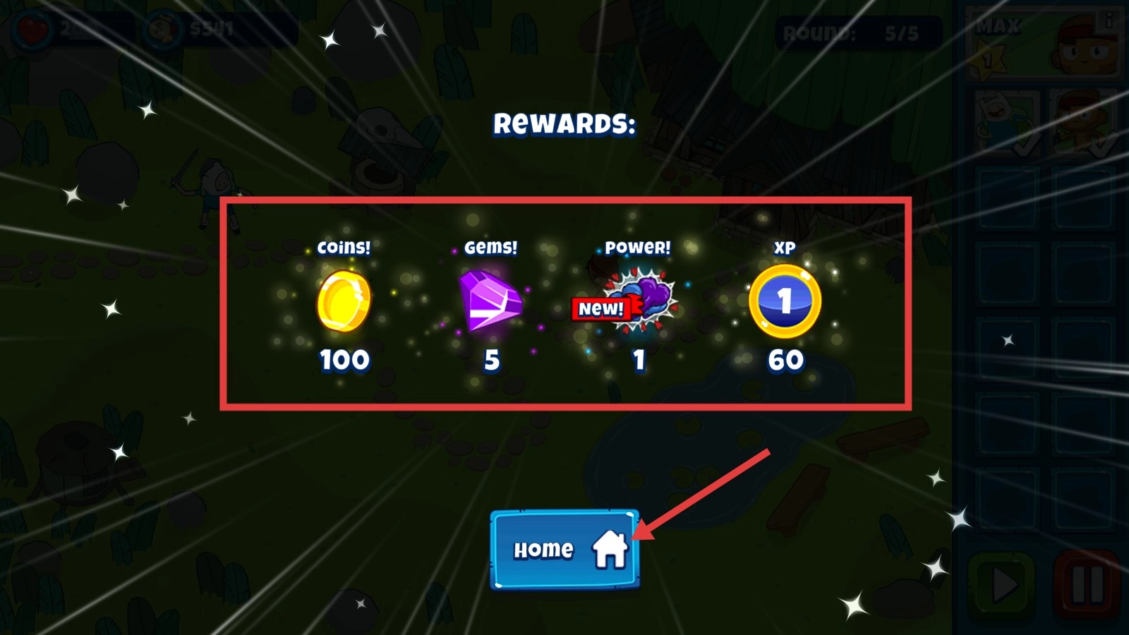 4、完成關(guān)卡后,領(lǐng)取獎(jiǎng)勵(lì)并點(diǎn)擊【Home】返回主頁。