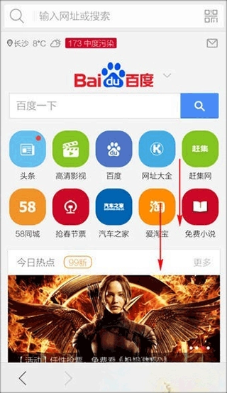 1、啟動獵豹手機(jī)瀏覽器后,向下滑動屏幕,找到并點(diǎn)擊【熱門影視】入口。