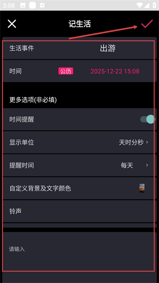 3、進(jìn)入“記生活”界面后,填寫事件名稱與時(shí)間,根據(jù)需求設(shè)置提醒、顯示單位等相關(guān)選項(xiàng),隨后點(diǎn)擊確認(rèn)按鈕完成保存操作。