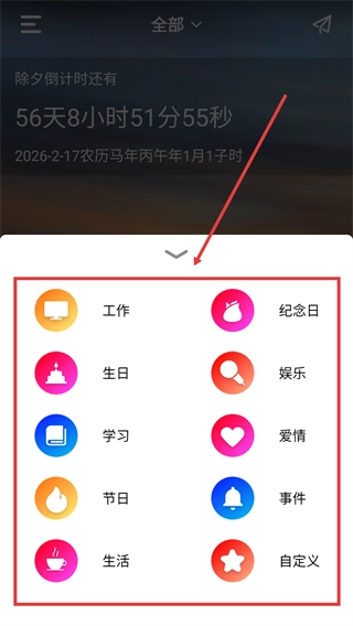 1、在倒計(jì)時(shí)主界面,點(diǎn)擊右上角的功能按鈕,能展開分類選項(xiàng)列表,從中挑選要記錄的事件類型。