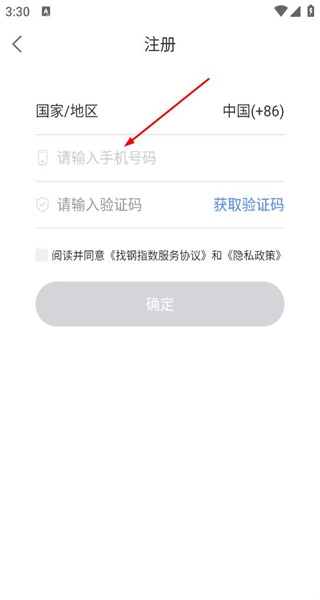 4、進入注冊頁面,選擇地區(qū)后輸入手機號,獲取并填寫驗證碼,勾選協(xié)議后點擊確定完成注冊。