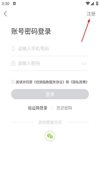3、進入賬號密碼登錄頁面,可看到手機號密碼輸入項,點擊右上角注冊選項進入賬號注冊頁面。