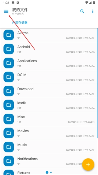 1、進(jìn)入Solid Explorer的我的文件頁面,點(diǎn)擊左上角的三條橫線圖標(biāo),展開側(cè)邊欄菜單。