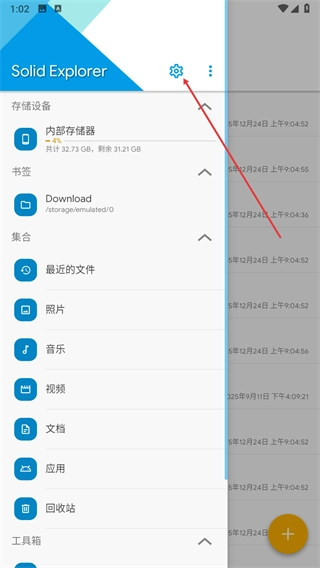 2、在側(cè)邊欄菜單里找到設(shè)置選項(xiàng),點(diǎn)擊它就能進(jìn)入Solid Explorer的設(shè)置頁面。