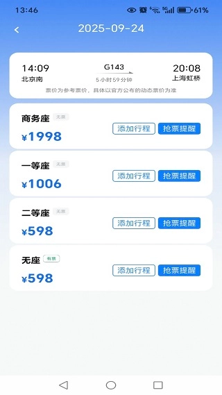 3、會(huì)展示出你行程計(jì)劃當(dāng)日的所有產(chǎn)品,并提供對(duì)應(yīng)的余票和票價(jià)信息。