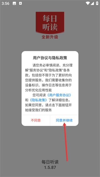 打開“每日聽讀”應(yīng)用后,仔細閱讀彈窗里的《用戶服務(wù)協(xié)議》和《隱私政策》內(nèi)容,然后點擊【同意并繼續(xù)】按鈕,這樣就能進入應(yīng)用的主界面了。