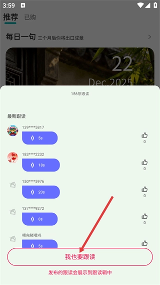 在主界面的每日一句內(nèi)容區(qū)域,點擊【跟讀】按鈕,即可進入跟讀互動頁面。