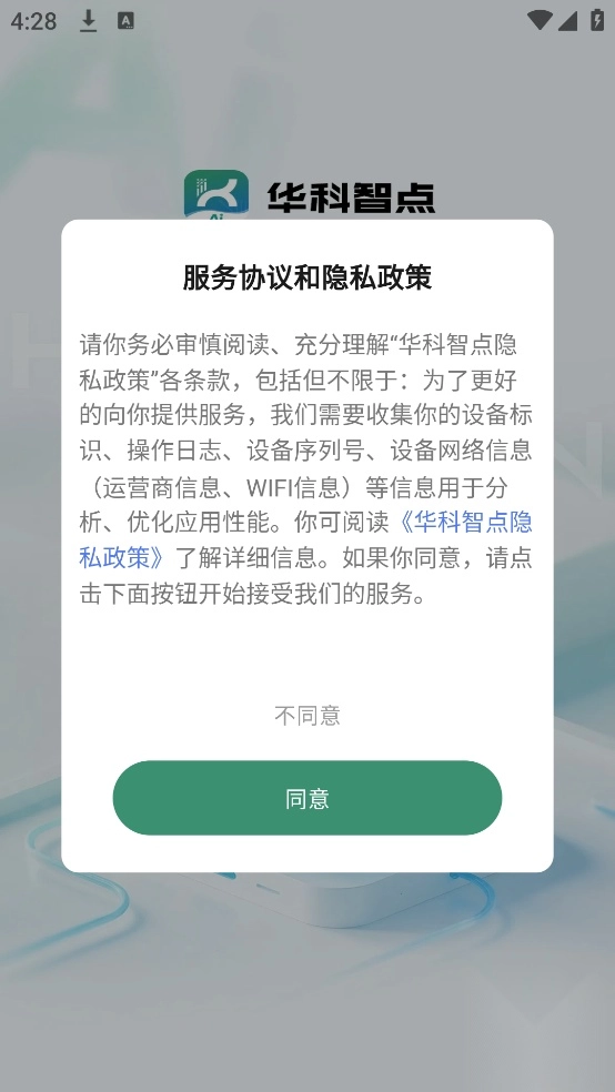 1、打開手機上的華科智點,進入的時候需要先同意隱私權限。