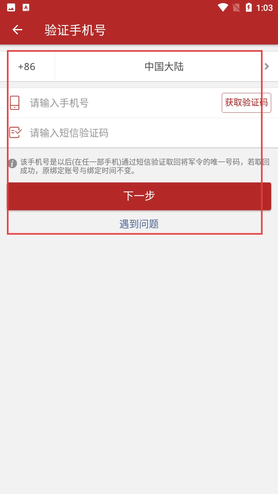 在手機號驗證頁面,填寫手機號與短信驗證碼后,點擊【下一步】按鈕。