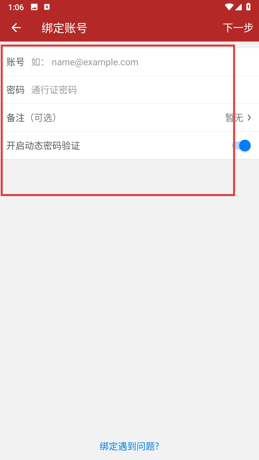 在賬號綁定界面,輸入對應的賬號與密碼,還能根據(jù)需要填寫備注信息,開啟動態(tài)密碼驗證功能后,點擊【下一步】按鈕即可。