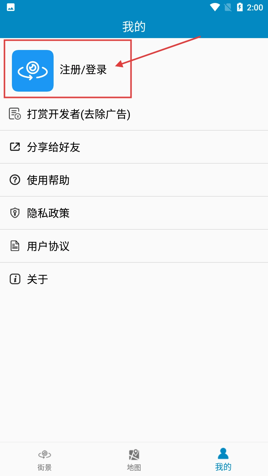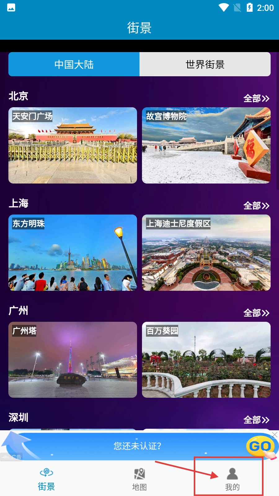 在街景類首頁,點(diǎn)擊右下角的【我的】按鈕,即可進(jìn)入個(gè)人中心頁面。