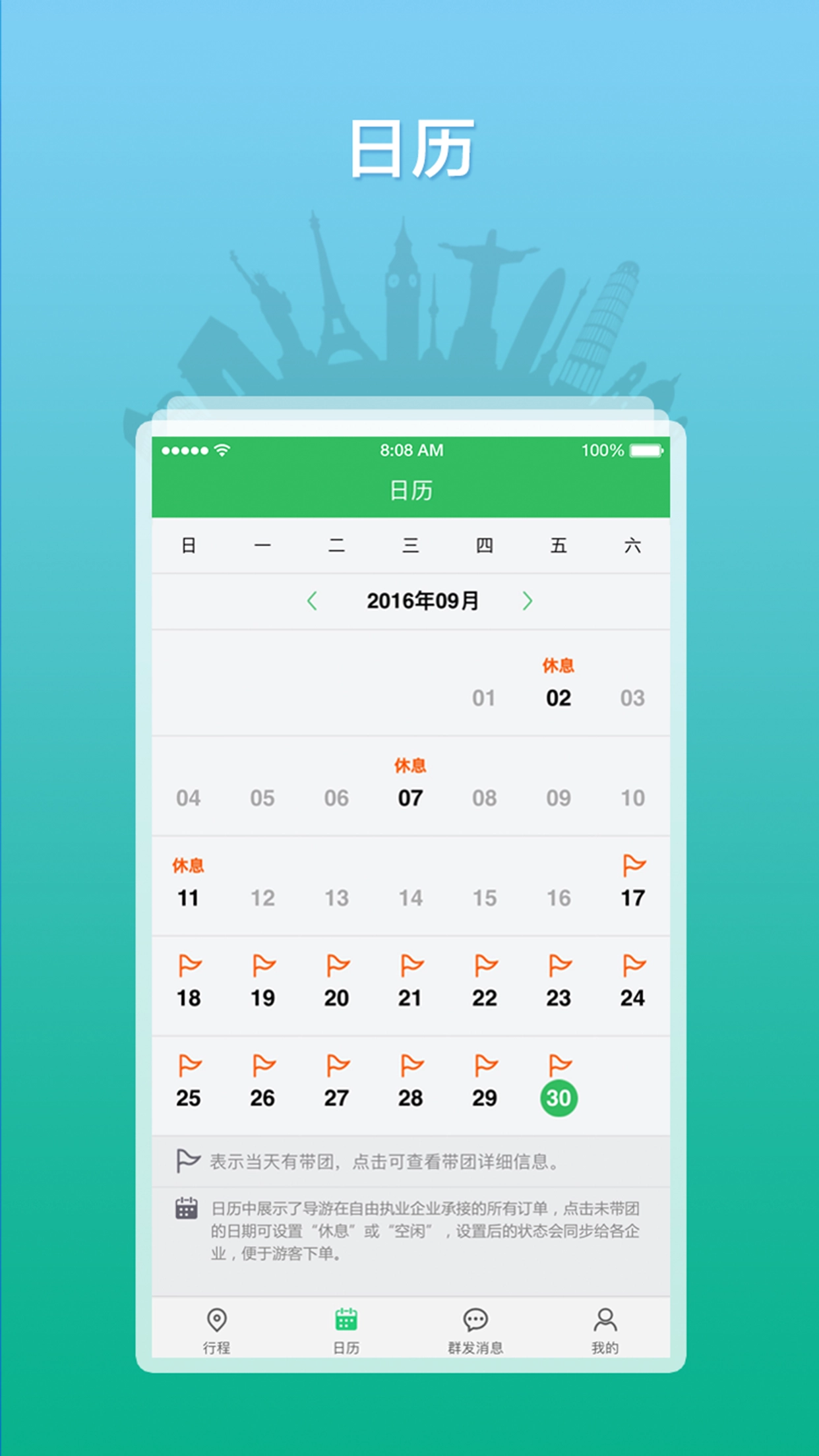 可以自由設(shè)置“空閑”或者“休息”的狀態(tài),這樣能協(xié)助導(dǎo)游更清晰地規(guī)劃工作時(shí)間,從而合理地分配精力。