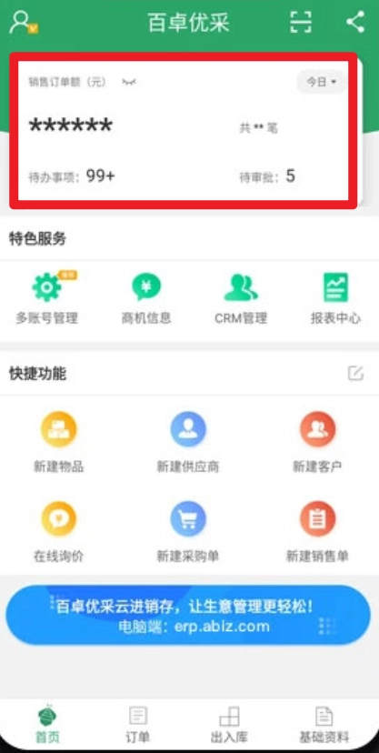 1、進入百卓優(yōu)采主頁面,用戶可看到生意的營業(yè)額。