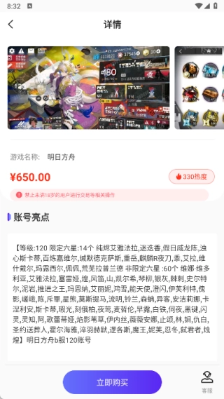 在游戲賬號頁面能查看詳細的賬號特色,用戶點擊“立即購買”按鈕就能完成快速交易。