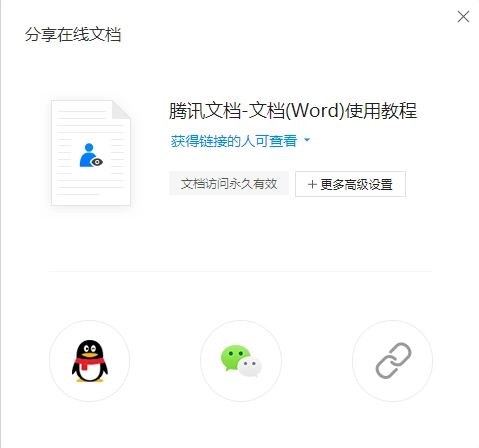 2)點(diǎn)擊“分享”按鈕,生成鏈接,你可以復(fù)制鏈接發(fā)送給他人,或直接分享到QQ、微信;也可設(shè)置文檔的權(quán)限及高級(jí)設(shè)置等。(詳細(xì)用法見第五章)