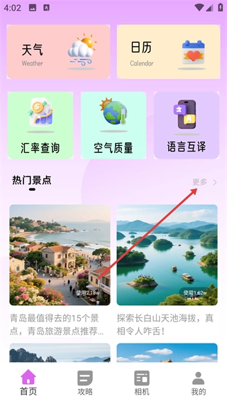 1、在首頁的“熱門景點”板塊中,點擊右側(cè)的【更多】按鈕,即可進入景點推薦的完整列表頁面。