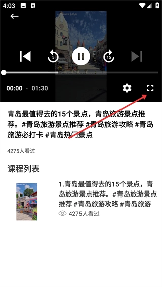 在視頻播放界面,可借助播放控制按鈕(例如全屏按鈕)來調(diào)整播放狀態(tài),進而觀看景點推薦的視頻內(nèi)容。