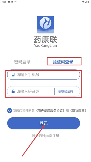 4、若選擇【驗(yàn)證碼登錄】方式,在輸入號(hào)碼后點(diǎn)擊【獲取驗(yàn)證碼】,待收到驗(yàn)證碼并填寫(xiě)完畢,勾選相關(guān)協(xié)議,最后點(diǎn)擊【登錄】按鈕即可完成驗(yàn)證流程。