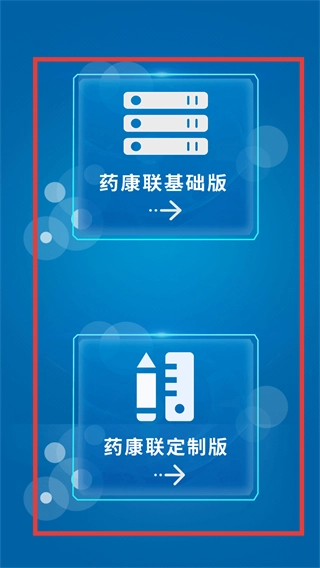2、在版本選擇頁(yè)面,可選擇【藥康聯(lián)基礎(chǔ)版】或【藥康聯(lián)定制版】,隨后進(jìn)入對(duì)應(yīng)版本的登錄流程。