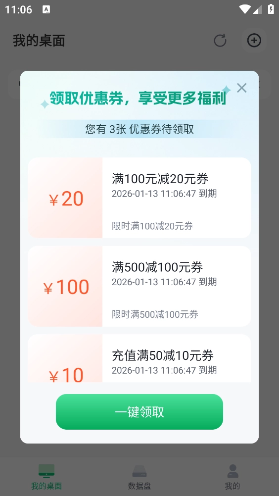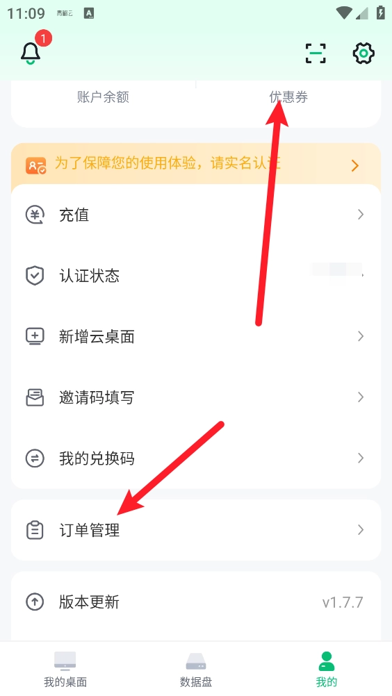 7、最后,在“我的”頁面可以查看優(yōu)惠券、訂單、云桌面等內(nèi)容。