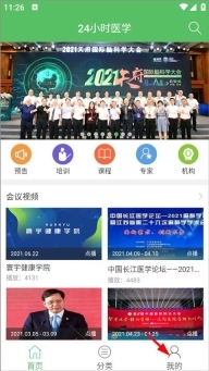 1、用戶通過打卡24小時醫(yī)學(xué)頻道進入軟件首頁,在首頁能查看培訓(xùn)課程、專家信息、機構(gòu)課程等內(nèi)容,隨后點擊“我的”選項;