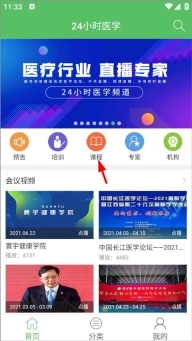 1、用戶登錄24小時醫(yī)學(xué)頻道后,在首頁可看到預(yù)告、培訓(xùn)、課程、專家及會議視頻等各類視頻資料,隨后點擊“課程”板塊;