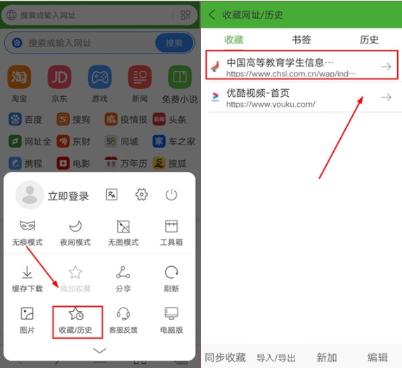 4、之后若要再次打開該網(wǎng)頁,直接在首頁點(diǎn)擊菜單欄,然后點(diǎn)擊收藏內(nèi)的網(wǎng)址即可跳轉(zhuǎn),無需再次查找或搜索。