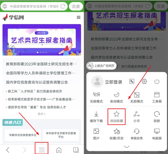 進(jìn)入網(wǎng)頁后,若想把該網(wǎng)頁添加到書簽,可點(diǎn)擊上方的選項(xiàng)鍵,此時(shí)會(huì)彈出一個(gè)菜單,在菜單中點(diǎn)擊收藏鍵,就能將網(wǎng)址保存到收藏夾里。
