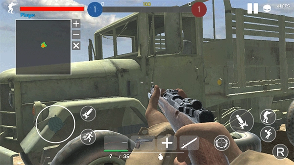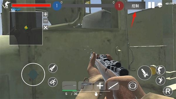 7、進(jìn)入游戲后,利用左邊的搖桿進(jìn)行移動(dòng)操作,滑動(dòng)屏幕可控制方向。在右側(cè),從左到右依次排列著瞄準(zhǔn)按鈕、開火按鈕、站立/下蹲按鈕、跳躍按鈕以及換彈按鈕……