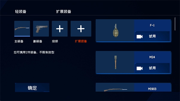 5、拓展裝備選擇:依次挑選主武器、副武器、投擲武器以及其他拓展裝備,全部挑選完成后,點(diǎn)擊“確定”。