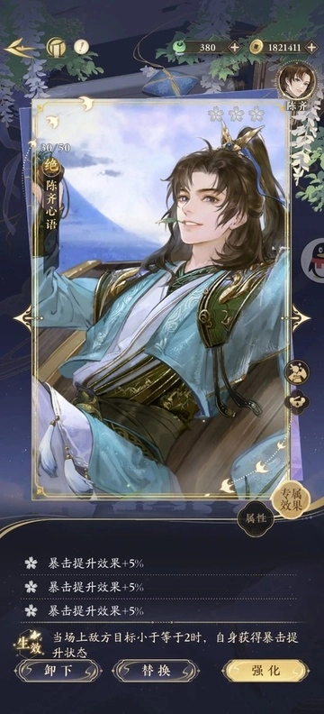 2這位名士的群體攻擊絕技附帶概率效果,能讓己方當(dāng)前攻擊力最高的隊友獲得額外攻擊機會,因此若該核心輸出恰好擁有可釋放的絕技,便能達成連續(xù)兩次發(fā)動絕技的效果;同時,當(dāng)他裝備特定的心語套裝時,還可為全隊提供暴擊屬性加成。