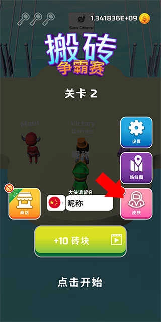 3、上方第一欄位角色模型,第二欄為磚塊樣式,而第三欄為角色皮膚顏色,大家根據(jù)自己喜好解鎖即可(解鎖方式為點(diǎn)擊直接解鎖,最下方按鈕為看廣告加金幣的按鈕,部分物品可以通過金幣點(diǎn)擊購(gòu)買,而部分物品需要觀看多次廣告以及付費(fèi)購(gòu)買)