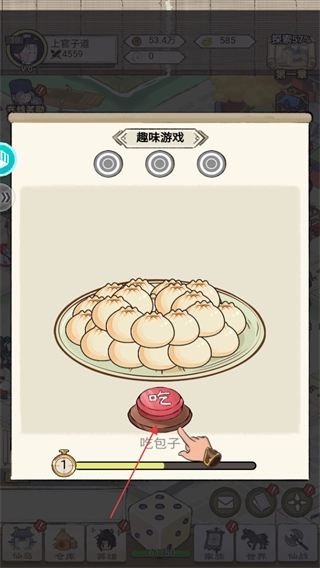 3、趣味游戲會隨機(jī)出現(xiàn),像吃包子游戲就需要在倒計時結(jié)束前,通過點(diǎn)擊下方的紅色按鈕來吃完所有包子。