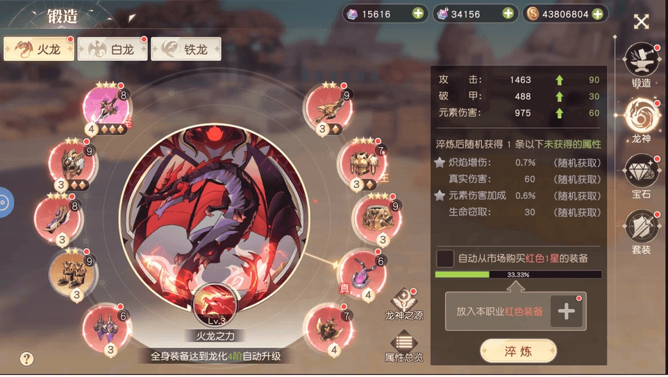 龍神系統(tǒng)可理解為全新的裝備升品板塊,當(dāng)玩家等級達到對應(yīng)要求時,會解鎖龍神界面。若裝備的稀有度與星級滿足條件,即可最終激活該龍神。龍神自身帶有等級和技能,但這部分為玩家?guī)淼膶傩蕴嵘^為有限。玩家通過該系統(tǒng)的核心收益,其實是對裝備進行淬煉強化:如圖所示,當(dāng)裝備右下角的經(jīng)驗條填滿時,會隨機新增一項屬性,這對裝備本身是較為顯著的提升。不過淬煉需要消耗紅色1星及以上品質(zhì)的裝備,這里建議僅用紅色1星裝備參與淬煉——2星以上的紅裝另有他用,而1星紅裝的實用價值較低,恰好可通過淬煉系統(tǒng)合理消耗。裝備經(jīng)淬煉升星后,獲得的星級將同步計入龍神之源面板;此外,若后續(xù)更換裝備,原有的龍神淬煉效果也會自動繼承至新裝備上。