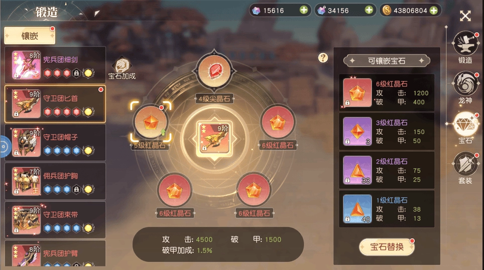 寶石作為裝備的鑲嵌部件,每件裝備設(shè)有5個鑲嵌孔位,不同孔位對應(yīng)可鑲嵌的寶石類型各異。鑲嵌的寶石等級越高,為裝備提升的戰(zhàn)力數(shù)值就越大。當(dāng)所有裝備鑲嵌的寶石等級均滿足特定要求時,將觸發(fā)額外的寶石加成效果。系統(tǒng)會智能提示當(dāng)前鑲嵌的寶石是否有可替換或升品的選項。寶石升品過程需要消耗低等級寶石,因此日常需留意積累低級寶石。獲取寶石的途徑包括商店購買和參與運營活動。
