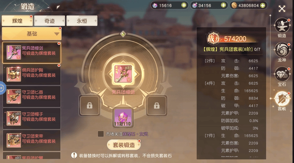 穿戴指定數(shù)量的輝煌、奇跡、永恒裝備可激活套裝效果,從而獲取大量戰(zhàn)力。