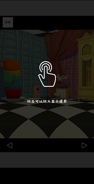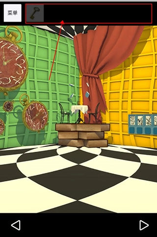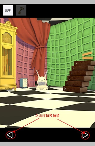 開(kāi)局畫(huà)面切換兩次視角,中間出現(xiàn)戴綠帽子的角色。用錘子敲碎桌上玻璃罩獲取胡蘿卜,將其放置在開(kāi)局畫(huà)面左側(cè)桌子的空盤(pán)里。返回粉色房間,翻開(kāi)左側(cè)椅子上的書(shū)得到操作順序,回到開(kāi)局畫(huà)面對(duì)應(yīng)位置開(kāi)啟墻上機(jī)關(guān),獲得藍(lán)色懷表。在桌子下方閃光處找到茶壺幣,投入游戲機(jī)玩游戲贏得變小藥水。將藥水對(duì)開(kāi)局畫(huà)面右側(cè)中間的大兔子使用,點(diǎn)擊窗簾下方并掀開(kāi)窗簾后離開(kāi)。按照開(kāi)局畫(huà)面里杯子的顏色順序點(diǎn)擊路牌,前往茶會(huì)。