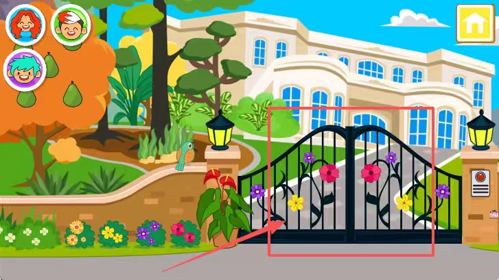 門前的灰色道路延伸至一棟白色的兩層房屋,房屋的窗戶是藍(lán)色的。只需點(diǎn)擊那扇裝飾著花朵的黑色鐵藝大門,即可開啟探索之旅。