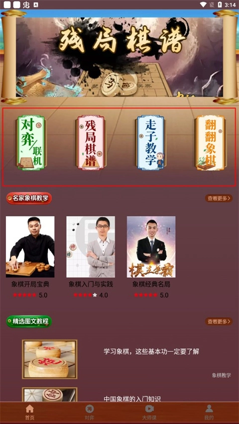 怎么看教學(xué)視頻?進(jìn)入主頁后,主頁上設(shè)有象棋玩法(包括對弈、聯(lián)機、殘局等模式)、圖文教程以及棋譜等內(nèi)容,接著點擊大師課。