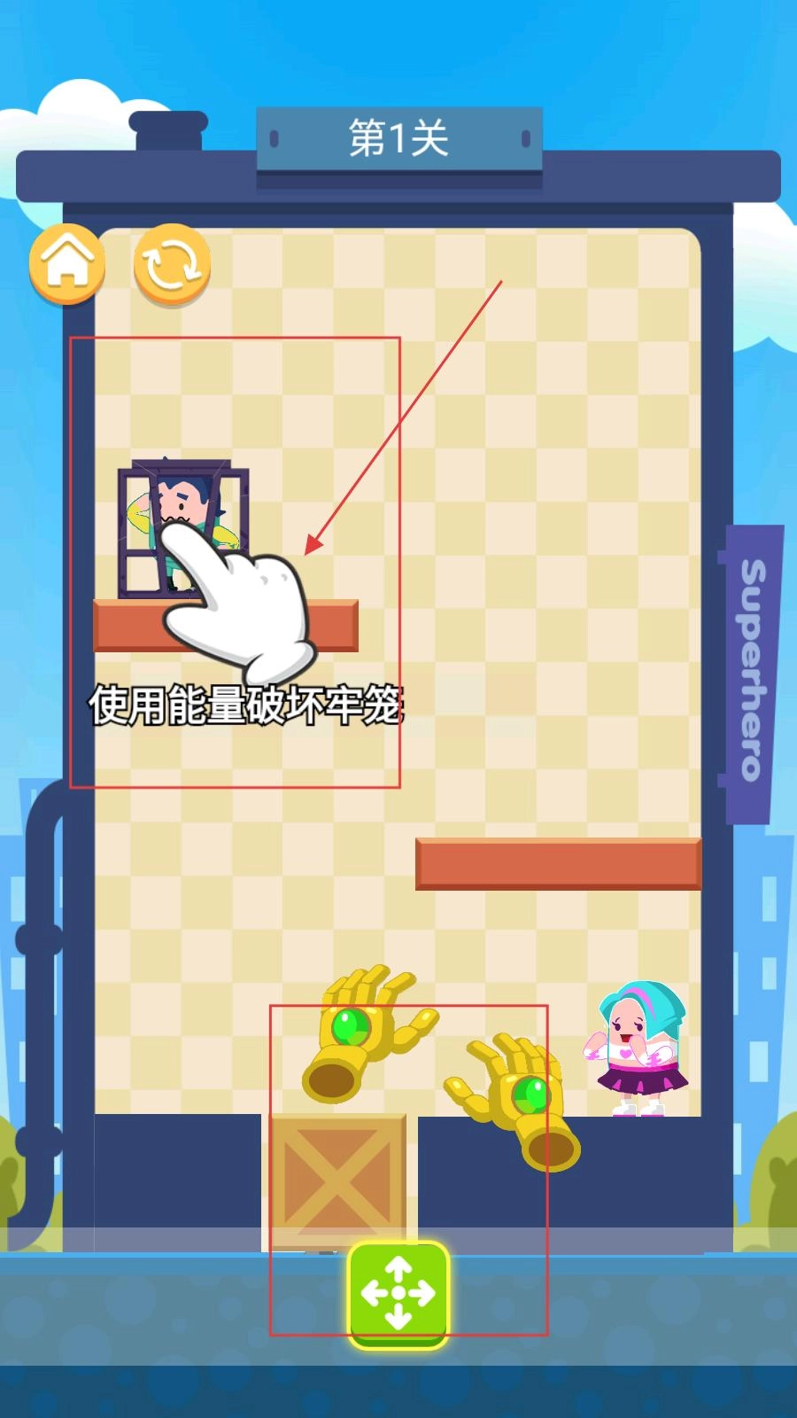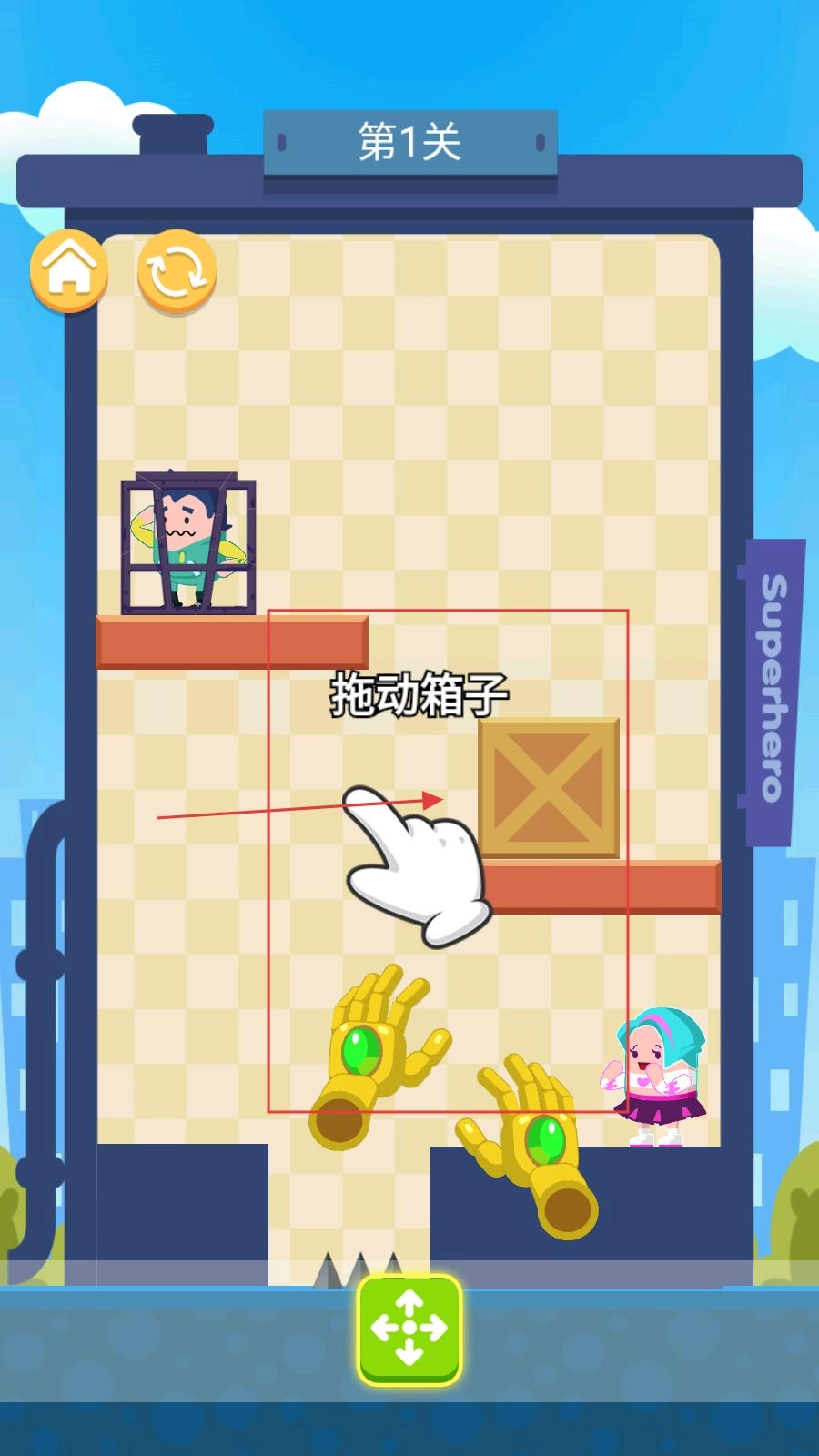 玩家進入關(guān)卡1后,需拖動箱子至合適位置搭建路徑以救助角色,為后續(xù)操作做好準備。