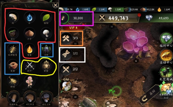 這里是提供各類建筑的區(qū)域,涵蓋生產(chǎn)、軍事、科技等不同類型,其中資源類建筑對(duì)應(yīng)下圖的紅色圈選部分,軍事類建筑對(duì)應(yīng)黃色圈選部分,科技類建筑對(duì)應(yīng)藍(lán)色圈選部分。需要重點(diǎn)關(guān)注的是蟻群數(shù)量(紫色框選)、工蟻數(shù)量(橙色框選)以及進(jìn)化菌絲(白色框選)這幾項(xiàng)內(nèi)容。