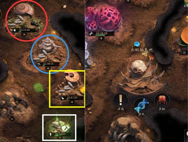 兵種孵化需要近衛(wèi)蟻孵化地(紅色圈)、射手蟻孵化地(藍(lán)色圈)、運(yùn)輸蟻孵化地(黃色框)、結(jié)繭介質(zhì)(白色框)以及兵蟻棲息地。