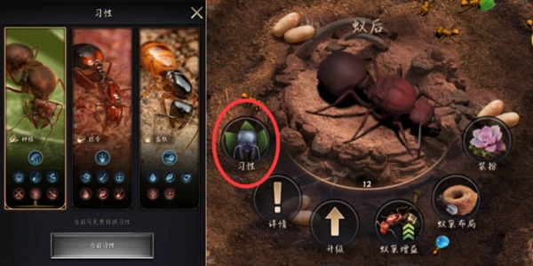 ⑨習(xí)性選擇可根據(jù)自身情況決定:偏好掠奪玩法的玩家可直接選擇掠奪習(xí)性;傾向掛機(jī)玩法的玩家,則可在畜牧和種植中任選其一。其中,畜牧習(xí)性更適合無法頻繁登錄游戲的玩家,有助于提升蜜露產(chǎn)量并減少進(jìn)食區(qū)的資源消耗;種植習(xí)性則適合借助資源加工地定期產(chǎn)出各類資源,同時(shí)配合兵蟻外出采集來提高采集速度,從而實(shí)現(xiàn)快速發(fā)展。
