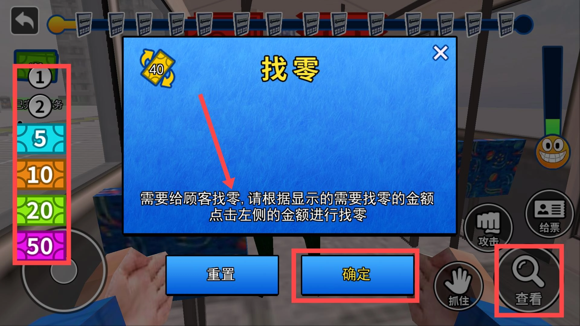 當(dāng)需要進(jìn)行找零操作時(shí),請(qǐng)依據(jù)具體金額在左側(cè)選擇對(duì)應(yīng)的紙幣,點(diǎn)擊確定按鈕即可完成找零流程,操作過(guò)程中可以利用查看功能來(lái)輔助完成。