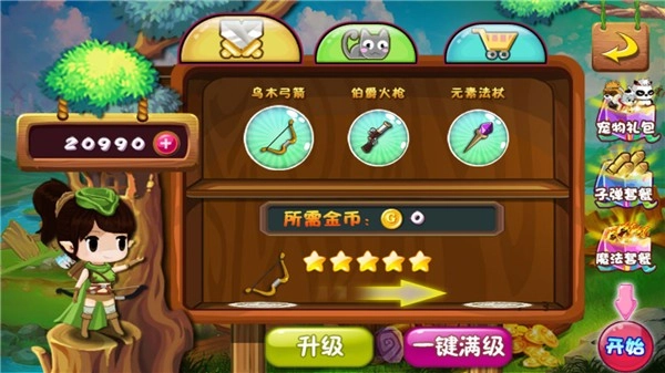 在道具界面中,玩家可以點(diǎn)擊空間武器下方的升級(jí)按鈕,以此強(qiáng)化弓箭、火槍與法杖的能力。點(diǎn)擊寵物切換區(qū)域可解鎖新的寵物,點(diǎn)擊購物車圖標(biāo)能夠解鎖各類道具,而點(diǎn)擊界面右側(cè)的禮包選項(xiàng),則可以消耗錢幣進(jìn)行購買。