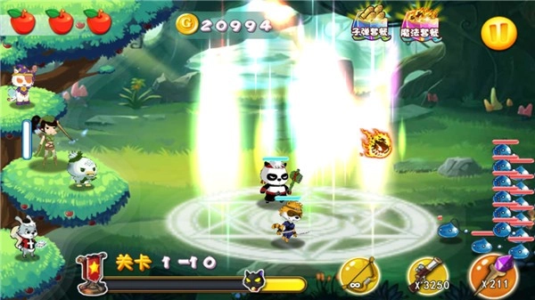 你率領(lǐng)一群身手出眾的小伙伴并肩作戰(zhàn),比如:箭術(shù)精準(zhǔn)的阿布、刀法凌厲的浣熊GG、精通醫(yī)術(shù)的兔子MM、力大無窮的熊貓大俠、擁有神奇魔力的貓咪小姐等,通過擊敗敵人來闖過各個(gè)關(guān)卡。