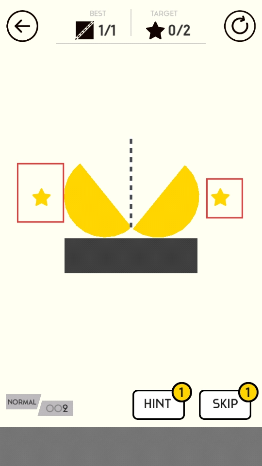 點(diǎn)擊NEXT按鈕即可進(jìn)入全新關(guān)卡,在該場(chǎng)景中會(huì)出現(xiàn)黃色圓形等物體,你需要仔細(xì)觀察這些物體的結(jié)構(gòu)特點(diǎn)以及它們周圍星星的分布位置,進(jìn)而思考合適的切割方法。