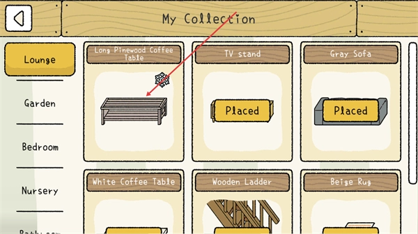 4、進(jìn)入MyCollection界面,查看已解鎖的家具,帶有Placed標(biāo)識的是已布置到場景中的物品,點(diǎn)擊未布置的家具進(jìn)行安放。