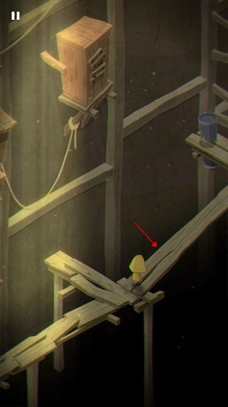 6、摩諾避開木桶,順著樓梯向上攀爬,使勁把這兩塊木板移開,就能進入下一個關(guān)卡了。