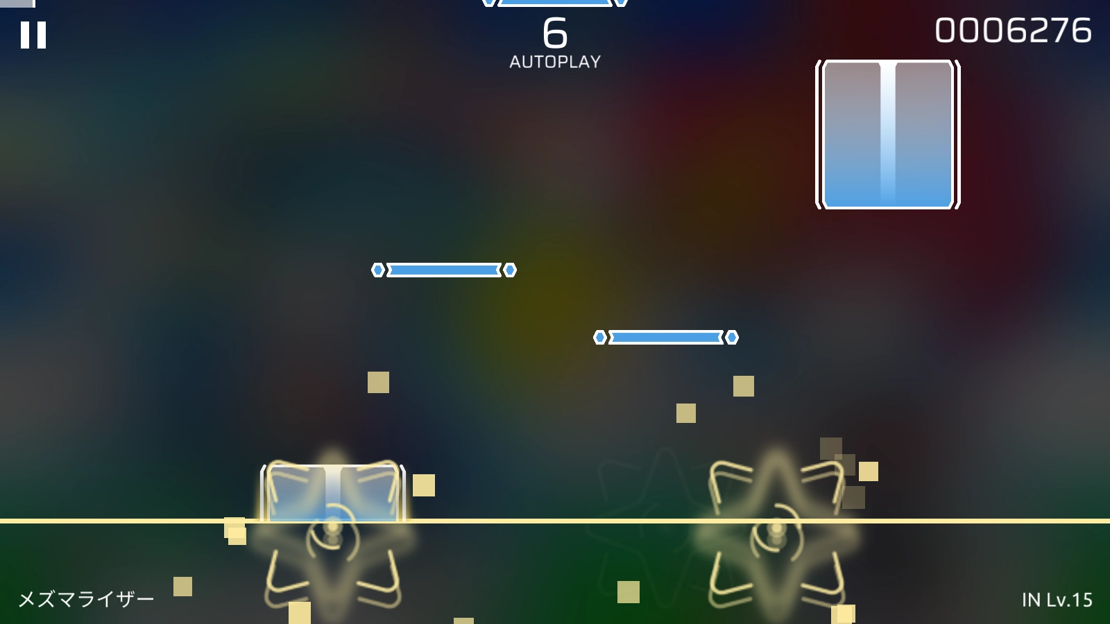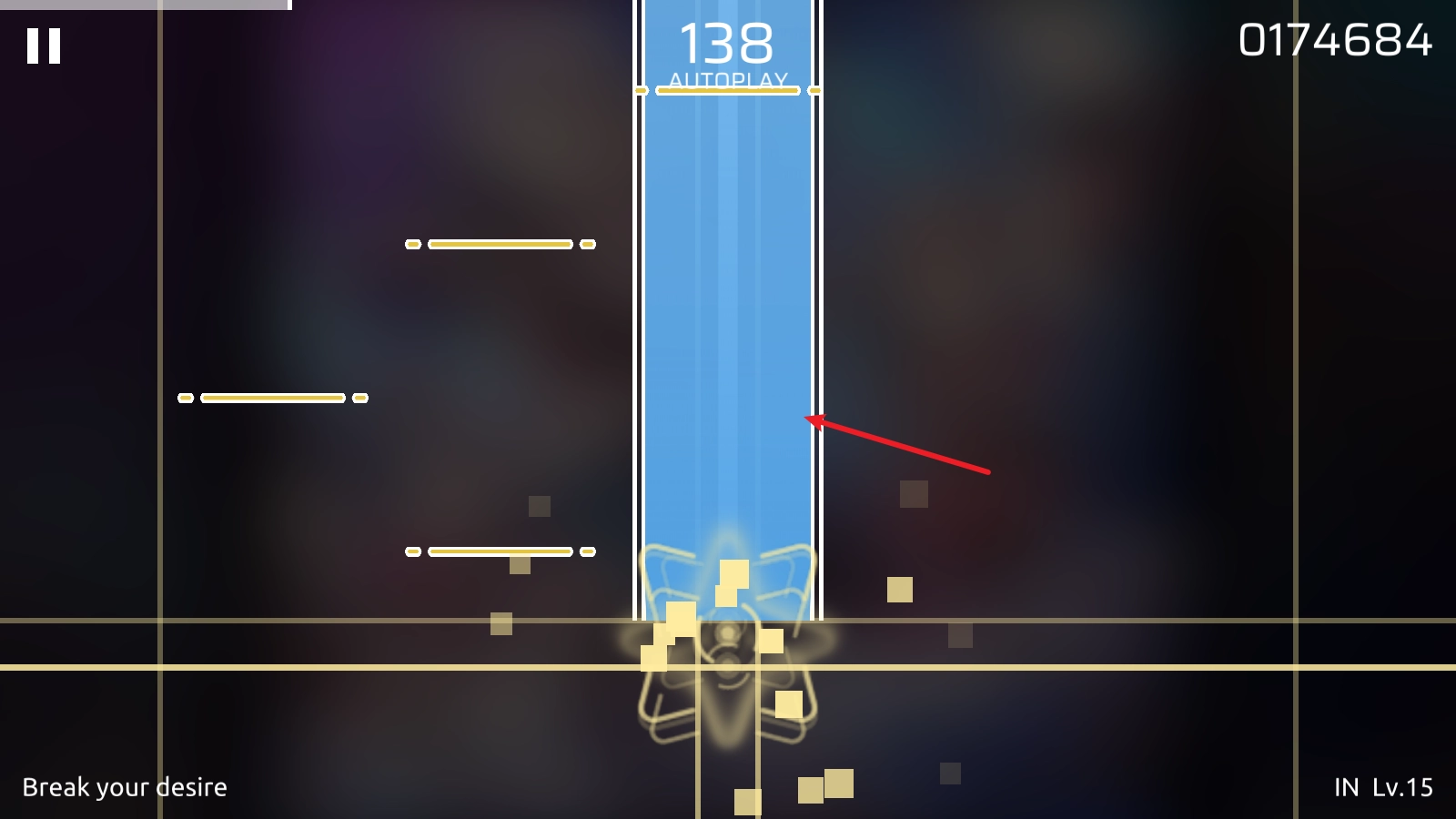6、接下來是柱形的音符,要在它抵達(dá)判定線時進(jìn)行長按操作。